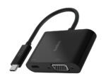 Corrente e video por uma única porta. Adaptador USB-C para VGA com Power Delivery até 60 W. Admite resolução de vídeo HD até 1920 x 1200 (1080p) a 60 Hz. Garantia de 2 anos. Cor preta. Medidas: 59 x 14 mm. Comprimento do cabo: 130 mm. O adaptador.