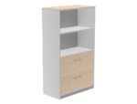 Estrutura de melamina de 25 e 19 mm de espessura, com cantos de PVC de 2 mm. Sistema de regulação independente graças a 4 niveladores com um espaço de 20 mm, protegidos por uma base metálica pintada em epoxy de cor alumínio. A parte traseira é formada por uma só peça fabricada em DM de 3 mm, de cor cinza dos dois lados. As prateleiras são de melamina, como a estrutura. Apresentada em dois tipos de acabamentos: Faia ou alumínio. Graças ao mecanismo existente nas partes laterais, podem ser colocadas em altura diferente. Também permite a fixação de prateleiras metálicas pintadas a epoxy de cor cinza e que permitem colocar capas na parte inferior. O topo existe em 3 acabamentos distintos: Faia, cinza ou BRANCO. Em todos os casos inclui só uma prateleira central.