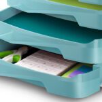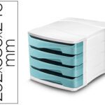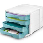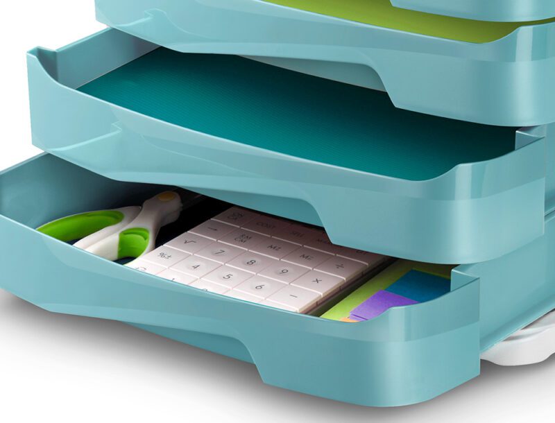 Bloco classificador com propriedades antibacterianas. A adição de um agente bactericida de iões de prata elimina a presença e o crescimento de bacterias. As gavetas extra largas aceitam documentos DIN A4 e de 24 x 32 cm, pastas de arquivo e pastas de elásticos. Gavetas equipadas com amortecedores que podem conter até 450 folhas. PS resistente, 100% reciclável. Cor verde água. Medidas: 292 x 386 x 246 mm.