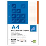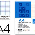 Din A4. Papel de 70 g/m². 1 banda de cor. 5 cores distintas. Pode utilizar-se comonbloco ou como recarga. 4 furos. Quadricula de 5mm. Bloco de 100 folhas.