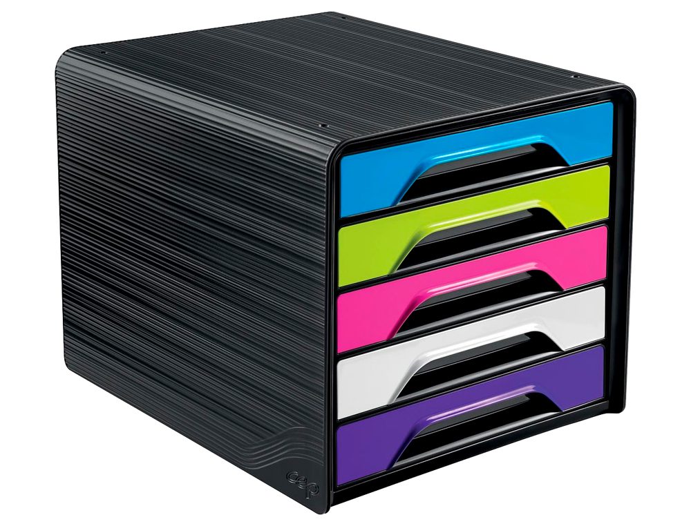 Bloco muito resistente. Acabamento com textura em relevo, contemporâneo e requintado. 5 gavetas com pegas ergonómicas e um orifício para facilitar a entrada de conteúdo. Indicado para pastas com dimensão até 24 x 32 cm. Com almofadas antiderrapantes e etiquetas de indexação. Capacidade útil de uma gaveta: 322 x 244 x 40 mm.
