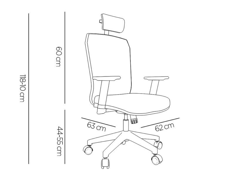 • Medidas adaptáveis: Com dimensões de 1180 mm de altura (ajustável +100 mm), 630 mm de largura e 625 mm de profundidade, adapta-se a diversos espaços e utilizadores.