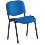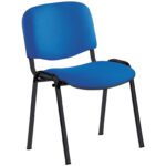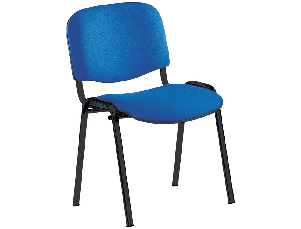 Cadeira confidente empilhável de quatro pernas. Assento e encosto em espuma injetada. Forradas em tela anti-fogo de cor azul. Estrutura tubular metálica em cor preto. Peso máximo suportado: 100 kg. Peso da cadeira: 5,2 kg.