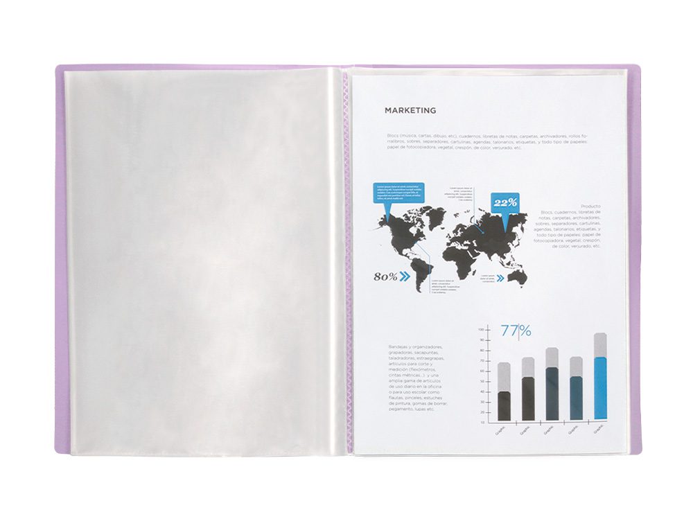 A pasta LIDERPAPEL Escaparate com 20 capas em polipropileno é uma opção prática e duradoura para quem necessita de uma solução eficaz para organizar e proteger documentos no formato DIN A4. O seu design lilás opaco acrescenta um toque de estilo a qualquer ambiente.