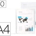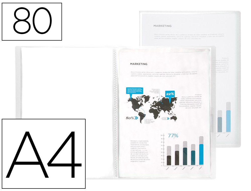 Fabricada em polipropileno translúcido. Formato Din A4. Capa flexível. Cores frosty. Capa 400 microns. Bolsas 40 microns. A pasta.