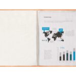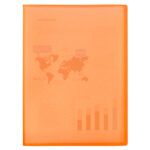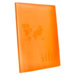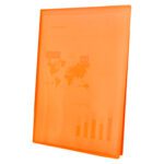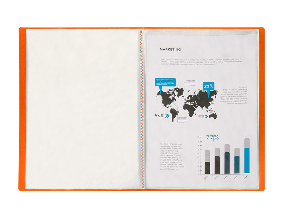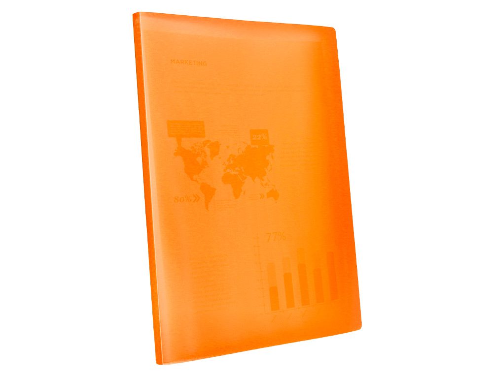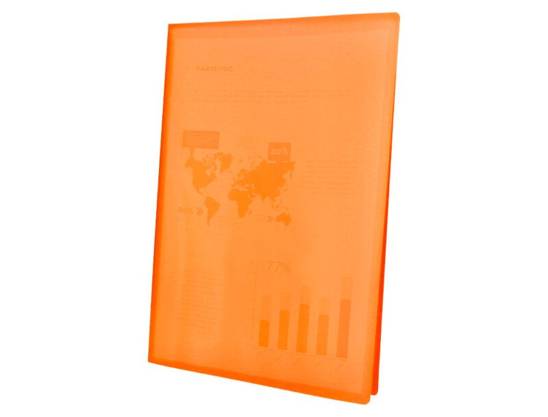 Em polipropileno. Capa flexível. Formato Din A4. Capa com 400 microns. Bolsas com 40 microns. Cores sortidas: amarelo, azul, vermelho e transparente.