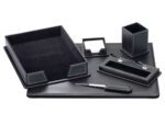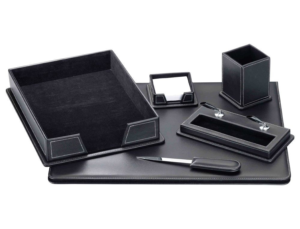 Conjunto de acessórios de secretária. Fabricado em imitação de pele. Contém 6 acessórios: base dupla, abre cartas, suporte para bloco de notas, porta lápis, suporte para esferográficas e tabuleiro porta documentos. Cor preta. Medidas da base: 400 x 500 x 10 mm. O conjunto.