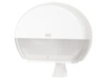 Dispensador para papel higiénico. Proporciona grande capacidade extra para papel higiénico jumbo. Compartimento para rolo até 35 m. Visor semitransparente para ver quando é preciso efetuar a reposição. Travão ótimo dos rolos para uma ágil dispensação sem risco de queda de papel ao solo. Dentes reforçados com fibra de vidro, corte limpo e simples do papel. Adequado para locais de grande afluência como escolas e outros locais públicos. Cor branco e transparente. Medidas: 34,5 x 27, 5 x 13, 2 cm.