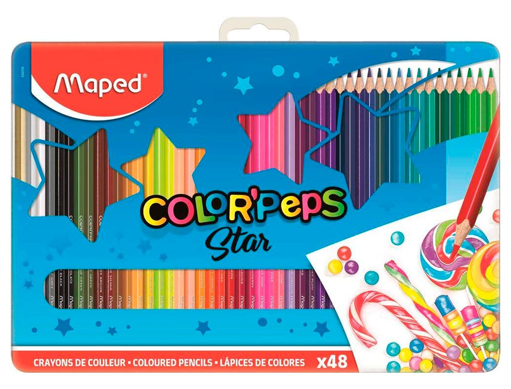 Lápis de cor triangulares color peps. Cores brilhantes. Caixa metálica de 48 lápis em cores sortidas. Altura do lápis: 175 mm. Diâmetro do lápis: 7 mm. Mina de 2,9 mm.