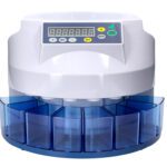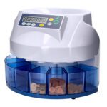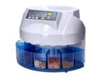 Este aparelho pode contar moedas de 2 formas. Contagem livre: conta todas as moedas que estejam na bandeja de entrada sem parar, até que uma das bandejas de saída esteja cheia. Com este modo a máquina predetermina o número de lote. Contagem por lote: conta por lotes de moedas, previamente introduzidas. Temperatura ambiente: 0 – 40 graus. Humidade ambiente: 30 – 80%. Capacidade da bandeja de entrada: 300 – 500 moedas. Capacidade da bandeja de saída: 80 – 150 moedas. Potência: AC220V / 50 Hz. Consumo: 45 W. Velocidade de contagem: 216 moedas por minuto. Peso líquido: 4,5 Kg. Medidas: 355 x 266 x 330mm.