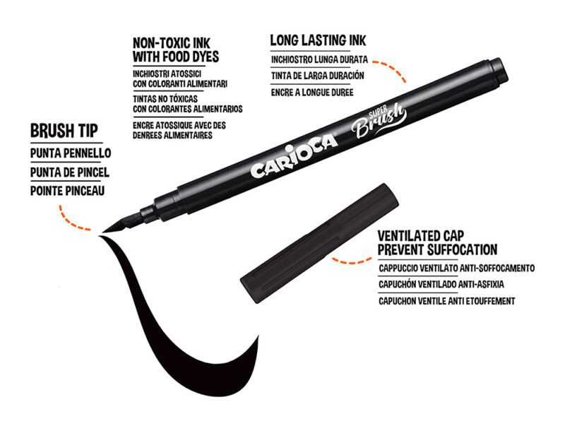 - Ponta de pincel flexível: Permite fazer traços finos ou grossos consoante a pressão, ideal para efeitos de lettering e sombreado.