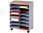 Móvel com rodas multiuso de 14 compartimentos. Estrutura de poliestireno. Acabamento superior de painel de partículas de melanina decorado faia. Alta resistência: Aguenta até 60 kg na parte superior e 3 kg por prateleira. Medidas dos compartimentos : 85 x 250 x 321 mm. Medidas: 720 x 514 x 330 mm. Cor cinza.