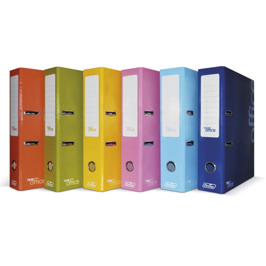 Arquivador colorido, em cartão revestido a papel plastificado. Com etiqueta impressa, rado e óculo.