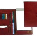 Fabrico artesanal em pele, com lapela, fecho com íman, parte interior com bloco de notas, suporte para esferográfica, porta cartões de visita, bolsa com fecho de mola, compartimento com fecho éclair e bolsa tipo aba. Formato Din A5. Cor castanha. Medidas: 190 x 275 x 30 mm. A pasta.