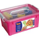Caixa de pintura a dedos que contém: 6 frascos de cores de 125 ml (amarelo, azul, branco, castanho, vermelho e verde), 4 esponjas, 4 templates e 1 rolo. O conjunto.