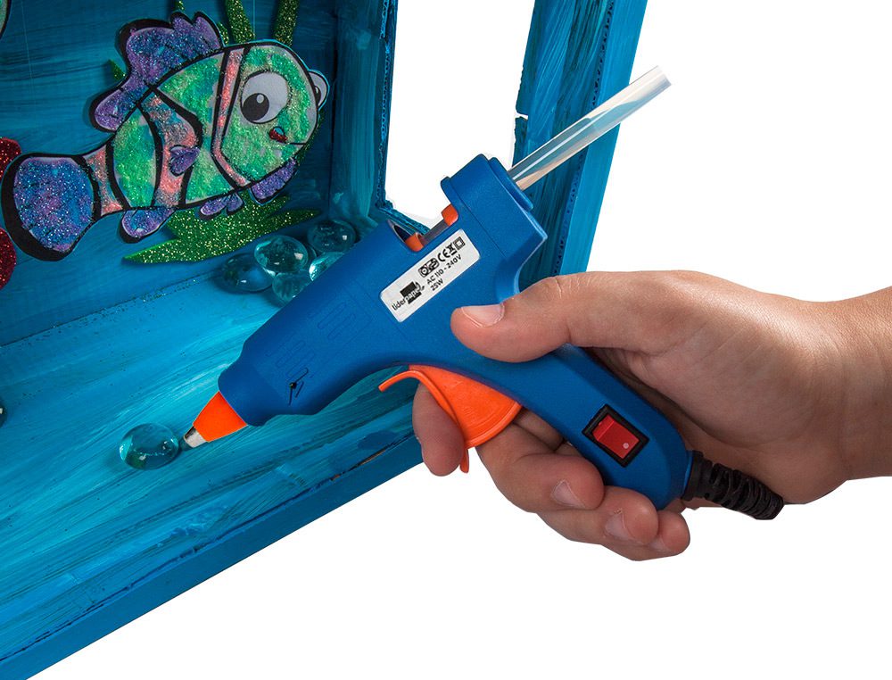Pistola de cola tamanho mini. Através de eletricidade, a pistola aquece para derreter a cola de plástico, que senempurra graças ao gatilho, para sair em forma líquida. Uma vez aplicada, endurece em aproximadamente umnminuto. Ideal para realizar trabalhos manuais. Uso escolar. Potência: 25 W. Inclui 2 barras sólidas de 100 mm dencomprimento x 7 mm de diâmetro. Medidas: 133 x 128 mm. A pistola.