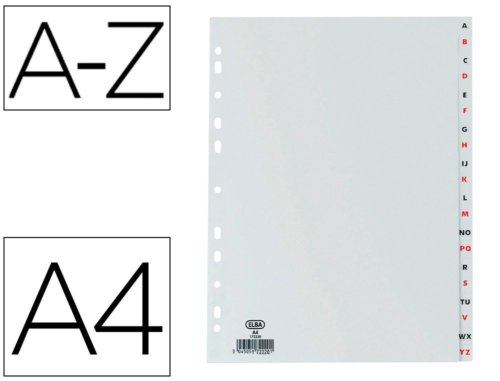 O Divisor Alfabético de plástico ELBA é a solução perfeita para manter os seus documentos organizados. Concebido com 120 microns de espessura e 11 furos, este divisor DIN A4 é durável e compatível com uma vasta gama de pastas e arquivos. O seu sistema de organização AZ é ideal para facilitar a pesquisa rápida de documentos em ambientes profissionais e pessoais.