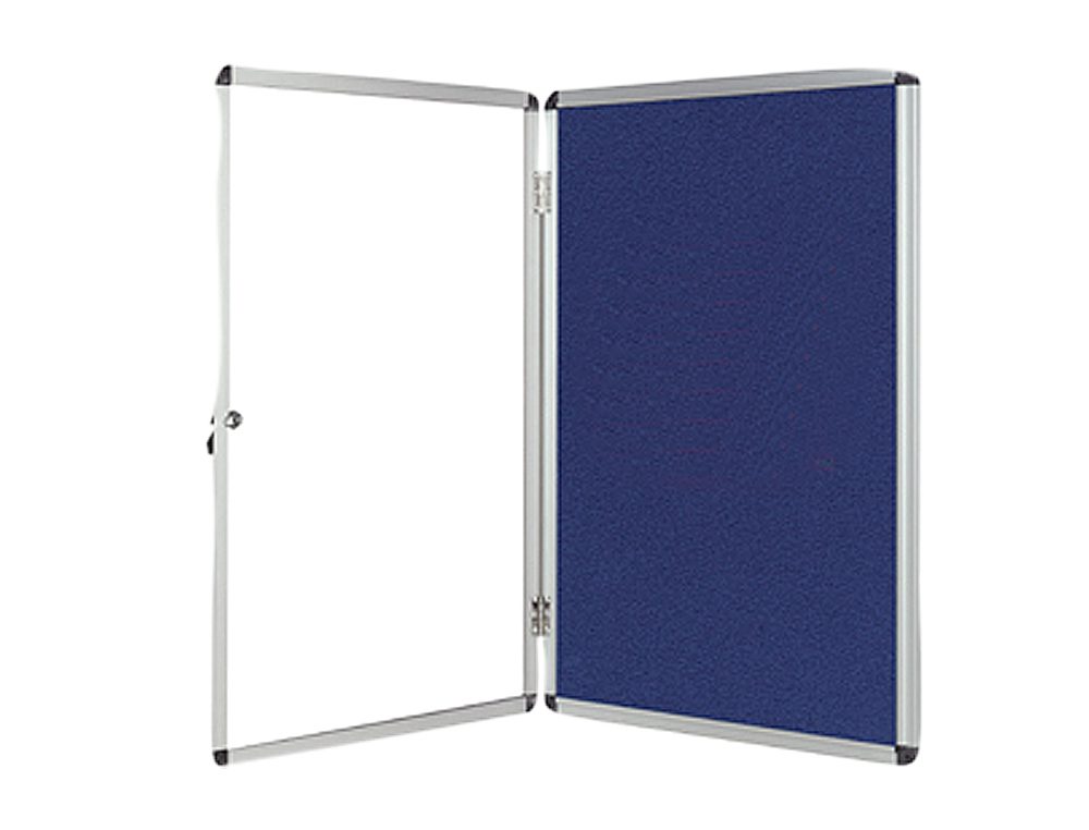 Com fundo azul, moldura de alumínio e cantos redondos. Para uso em interiores. Caixilho com fechadura e chaves. Feltro resistente ao fogo. Portas de metacrilato que oferecem uma excelente visibilidade. Ideal para colocar publicidades, notas, avisos, posters, etc… Com pionés ou velcro. Inclui kit de fixação à parede. Fundo: 4,5 cm. A vitrina.